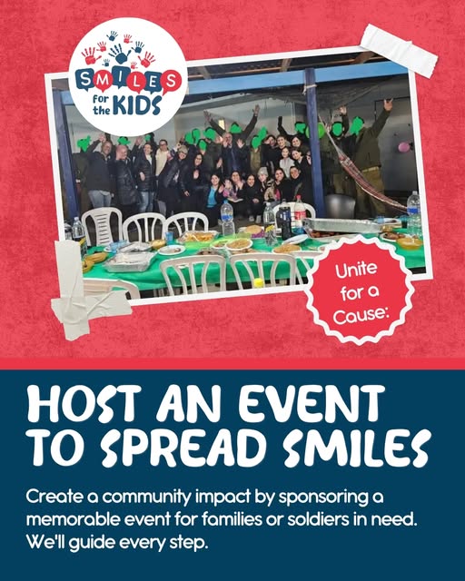 Bringing smiles to the families of our soldiers, evacuees, and communities all over Israel. Smiles for the Kids is a grassroots initiative with a mission to bring happiness and comfort to families impacted by hardship due to illness, poverty, stress, family situations or ongoing conflicts.
