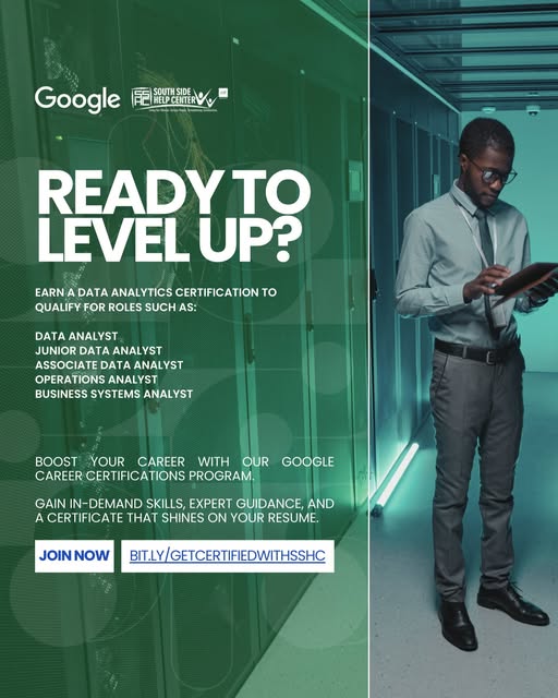 Ready to turn data into opportunities. With a Google Data Analytics Certification, you’ll gain the skills to qualify for roles like: Data Analyst Junior/Associate Data Analyst Operations Analyst Business Systems Analyst Boost your resume, sharpen your skills, and open doors to high-demand jobs in today’s data-driven world. Scholarships are now available.