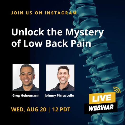 Unlock the Mystery of Low Back Pain Are you tired of persistent low back pain disrupting your life. Discover the true cause of your discomfort and learn how to find lasting relief by joining our upcoming webinar. Join Greg Heinemann (Egoscue of Westchester) and Johnny Pirruccello (Egoscue of Walnut Creek) on Wed, August 20th at 3pm ET where you will * Understand why your low back pain is often a symptom of imbalances elsewhere in your body, not the problem itself.