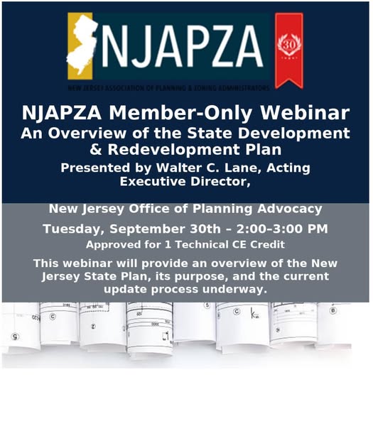 Topic: An Overview of the State Development & Redevelopment Plan When: Tuesday, September 30th - 2:00-3:00 Who: NJAPZA Members What: Webinar on the State Development & Redevelopment Plan approved for 1 Technical CE Credit This webinar will provide an overview of the New Jersey State Plan, its purpose, and the current update process underway. Register here: https://us02web. zoom.