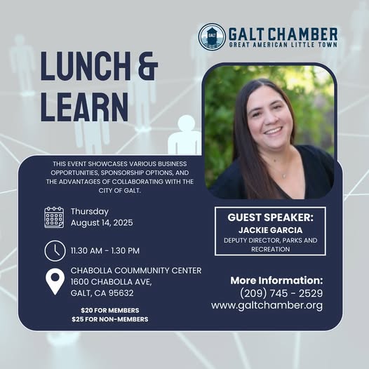 🚨 Join us for our August Lunch & Learn. 🚨 We’re excited to welcome Jackie Garcia, Deputy Director of Parks & Recreation, as our guest speaker. Jackie will share business opportunities, sponsorship options, and the benefits of collaborating with the City of Galt.