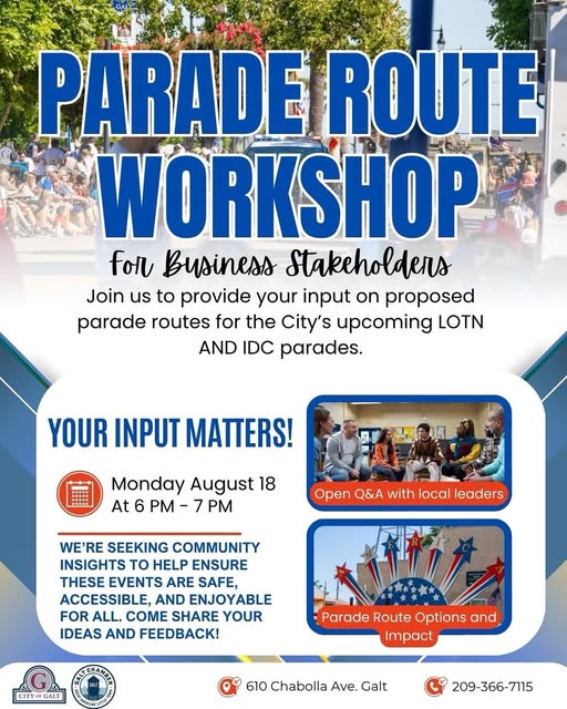 🚨 GALT CHAMBER – YOUR INPUT NEEDED. 🚨 We’re mapping out the routes for LOTN & IDC parades and we need YOUR ideas. 🗺✨ 📅 Mon, Aug 18 🕕 6–7 PM 📍 610 Chabolla Ave, Galt This is YOUR chance to speak up, shape the routes, and help make our parades safe, smooth & unforgettable 🎉 💥 Don’t just watch the parade… help create it.