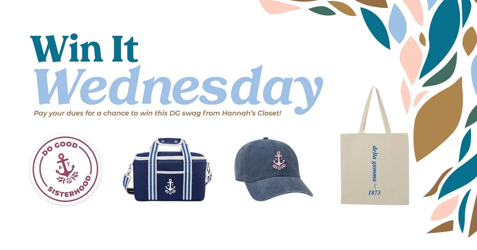 It's Win it Wednesday. In honor of Do Good Week coming up soon, we put together a Do Good swag bag of new DG merch 🤩 To be eligible to win, all you have to do is pay your alumnae per capita dues, be a 50-year member or be a member of Loyally Anchored. Fill out the form in the comments.