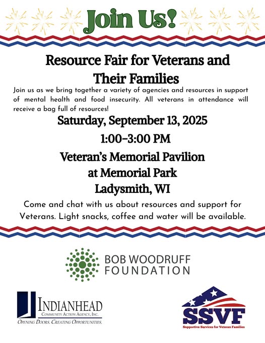 Join us for our Resource Fair for Veterans and Their Families Saturday, September 13th from 1:00 PM until 3:00 PM at the Veterans Memorial Pavilion at Memorial Park in Ladysmith, WI Multiple organizations will be on hand to share a wide range of resources and services that are available for all Veterans. Light refreshments will be available. For more information, please email penny.