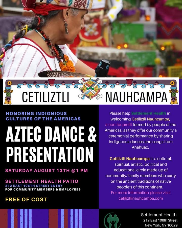 To celebrate the final day of National Health Care Center week, Settlement Health is honoring Indigenous cultures of the Americas with an Aztec Dance and presentation by Cetiliztli Naucampa. Join us in welcoming them next Saturday, August 13th, at 1pm. —————————————————— En celebración del último día de la semana Nacional de Centros de Atención de la Salud, Settlement Health rinde homenaje a las culturas indígenas de las Américas con una danza azteca y presentación ofrecida por Cetiliztli Naucampa.