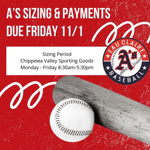 ‼️ATTENTION A’s PLAYERS‼️ Player sizing forms and final payments for the 2026 season are due by Saturday, November 1. The sizing form link can be found in your email. This week, Chippewa Valley Sporting Goods is hosting a sizing period in case you need to go try on gear.
