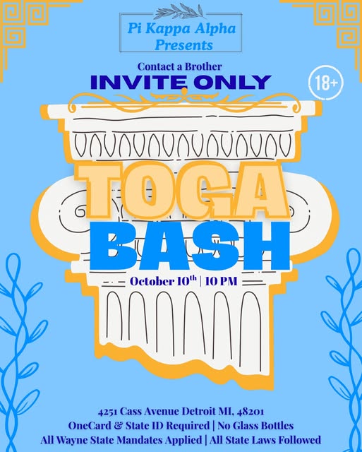 Join us this Friday for our Toga Bash at the PIKE House. Doors open at 10pm. 4251 Cass Avenue, Detroit MI 48201 *Rules that apply Invite Only | Contact a Brother 18+ No Glass Bottles State ID and OneCard Required All State Laws Apply All Wayne State Mandates Followed.