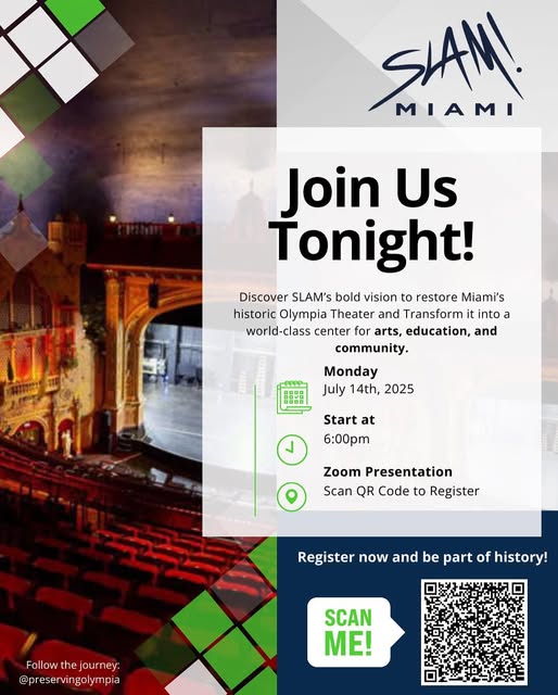 ๐จ TONIGHT at 6 PM. SLAM is leading the charge to restore Miamiโs historic Olympia Theater, and YOUโRE invited to hear all about it. ๐ญโจ Join us for a special Zoom presentation to learn how this $50 million project will become a hub for arts, culture, and student innovation โ right in the heart of the city.