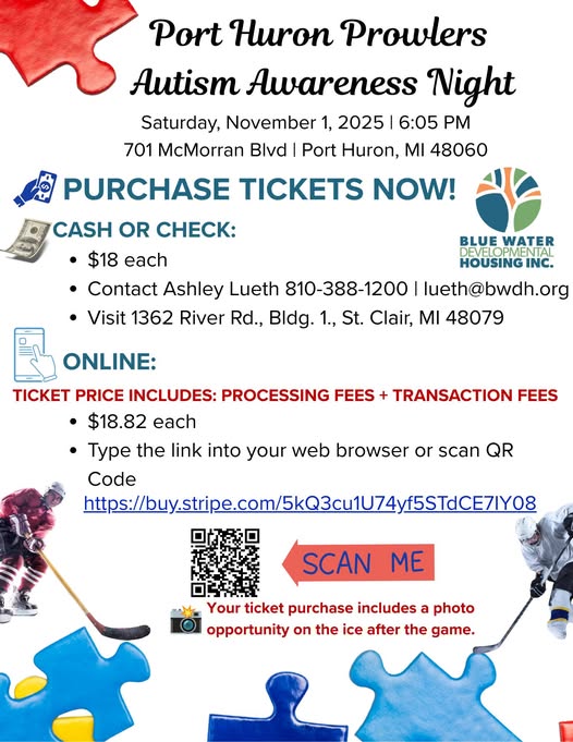 ππ Join Blue Water Developmental Housing, Inc. for Port Huron Prowlers Autism Awareness Night on Saturday, November 1st at 6:05 PM at McMorran Place Arena. Come cheer on the Prowlers while supporting autism awareness and inclusion in our community.