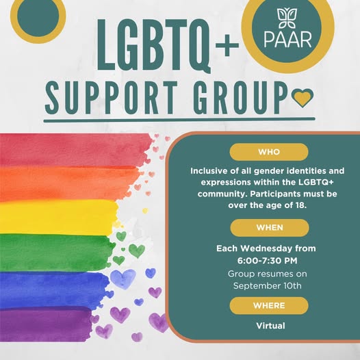 🌈 LGBTQ+ Support Group returns September 10 🌈 PAAR is offering an open support group for LGBTQ+ adults (18+) who have experienced sexual trauma. Together we’ll build community, explore shame, learn coping strategies, and practice grounding. Each session includes: ✔ Weekly check-ins ✔ Group-driven & self-reflective activities ✔ Grounding practices ✔ Space to share—at your pace 🗓 Wednesdays (Starting on September 10) 🕕 6:00–7:30 PM ET (Virtual - Link sent after registration) 👥 Not required to be a current PAAR client.