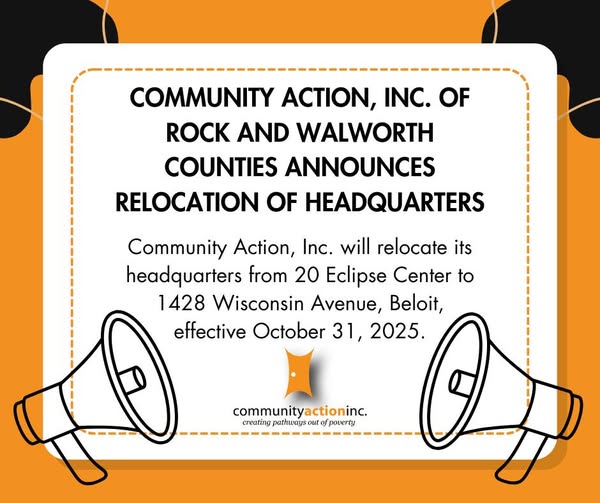 Community Action, Inc. of Rock and Walworth Counties (CAI) will be relocating its primary headquarters from 20 Eclipse Center to the Merrill Community Center at 1428 Wisconsin Avenue in Beloit, effective October 31, 2025. All CAI program locations, including the Pathways site at the Eclipse Center, will remain open and continue to serve the public throughout this transition.