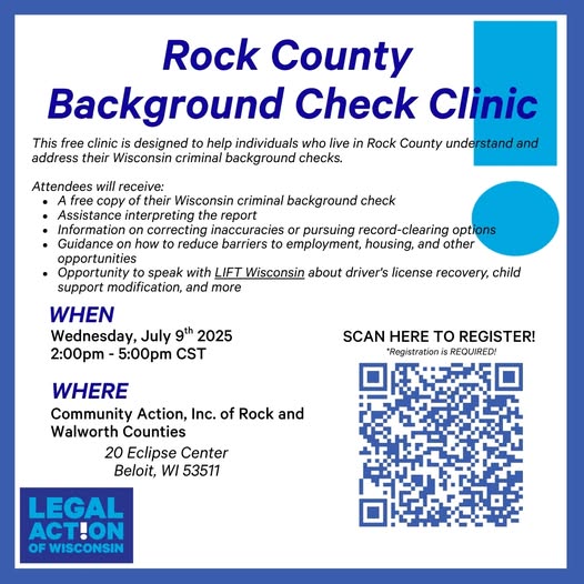 Happening Today: Free Background Check Clinic in Rock County Do you need help reviewing or understanding your background check. Thanks to the generous support of SSM Health St. Mary’s Hospital - Janesville, LIFT Wisconsin, Alliant Energy, and volunteer attorneys from Legal Action of Wisconsin a Background Check Clinic is taking place today at Community Action, Inc.