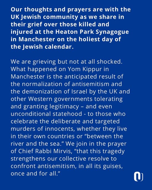 Our thoughts and prayers are with the UK Jewish community as we share in their grief over those killed and injured at the Heaton Park Synagogue in Manchester on the holiest day of the Jewish calendar. We are grieving but not at all shocked. What happened on Yom Kippur in Manchester is the anticipated result of the normalization of antisemitism and the demonization of Israel by the UK and other Western governments tolerating and granting legitimacy โ and even unconditional statehood - to those who celebrate the deliberate and targeted murders of innocents, whether they live in their own countries or โbetween the river and the sea.