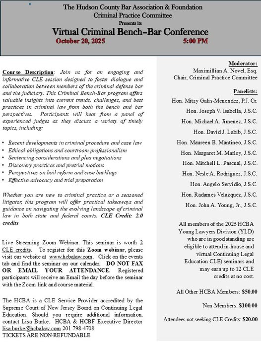 The Hudson County Bar Association was founded in 1877 as a nonprofit professional organization for attorneys. THE HUDSON COUNTY BAR ASSOCIATION HAS BEEN DEDICATED TO ADVANCING ITS MEMBERS' PROFESSIONAL DEVELOPMENT, PROMOTING THE HIGHEST STANDARDS OF EXCELLENCE IN THE PRACTICE OF LAW, AND FACILITATING ACCESS TO LEGAL SERVICES FOR THE HUDSON COUNTY COMMUNITY. THE HCBA ENCOURAGES QUALITY AND ETHICS IN THE PRACTICE OF LAW THROUGH THE PROFESSIONAL DEVELOPMENT OF OUR MEMBERS.