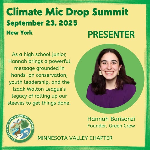 🌍 We're proud to announce that Hannah Barisonzi, a youth leader from our Minnesota Valley chapter, is representing the Izaak Walton League at Climate Mic Drop during Climate Week NYC. 🎤🌱 Hannah is bringing the Izaak Walton League’s mission and values to the global stage—speaking directly to an international audience of climate leaders, funders, policymakers, and media. Her message is rooted in hands-on conservation, youth leadership, and our century-long legacy of rolling up our sleeves to get things done.