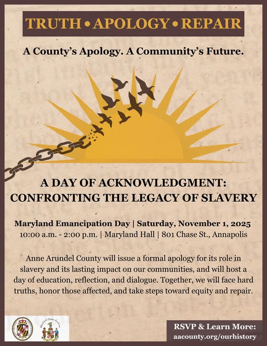 On Saturday, November 1, 2025, the County will issue a formal apology for the profound, far-reaching impact slavery has had on generations of Black Americans as part of a daylong event of education, reflection, and dialogue. The program, titled “A Day of Acknowledgement: Confronting the Legacy of Slavery,” will take place at Maryland Hall from 10 - 2 pm. The formal apology was requested by the Anne Arundel County Human Rights Commission, the NAACP, and the Caucus of African American Leaders.