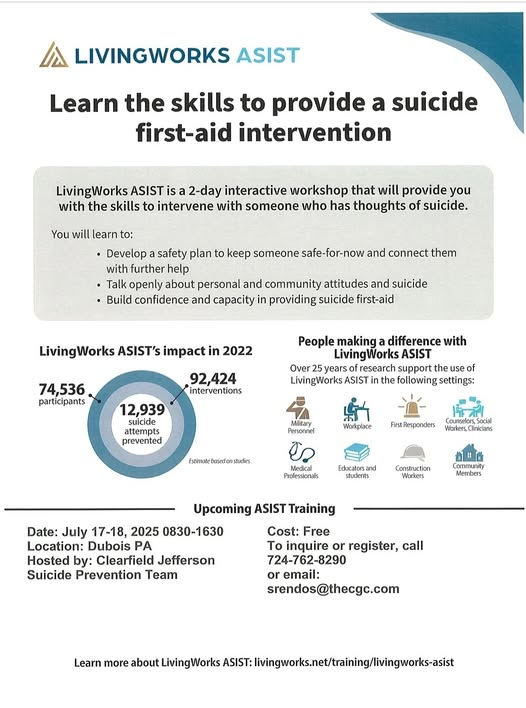 Clearfield Jefferson Suicide Prevention Team is dedicated to reduce the occurrence of suicide within our two-county area. Dedicated to reducing the occurrence of suicide in our two-county area.