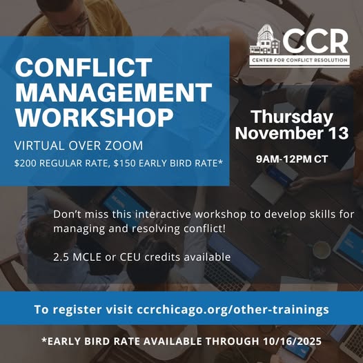 Conflict Resolution | Center for Conflict Resolution | Chicago HOME ABOUT CCR MEDIATION SERVICES TRAINING PROGRAMS VOLUNTEERING AT CCR SUPPORT CCR BLOG More INDEPENDENT NOTFORPROFIT NEWS UPDATE Contact us to request mediation or training services here. CCR Updates Get your very own CCR swag. Check out mugs tshirts and more at our online shop Center for Conflict Resolution39s shop at Fourthwall CCR in the News The Power of TenantLandlord MediationWatch this video to hear about how CCR can help people in the city of Chicago and beyond with tenantlandlord issues jump ahead to 110 to hear about CCR. TRAINING DIRECTOR PARI KARIM SPEAKS ON WBEZ ABOUT HOW TO HAVE PRODUCTIVE CONVERSATIONS AT THE HOLIDAY DINNER TABLE Listen to the episode CCR39S JUVENILE REENTRY MEDIATION PROGRAM IS FEATURED IN THE DISPUTE RESOLUTION JOURNAL Read the article CHICAGO IS HIGHLIGHTED AS A SUCCESS STORY IN ANEW YORK TIMESGUEST ESSAY ABOUT THE IMPORTANCE OF EVICTION DIVERSION PROGRAMS Read the article ABOUT CCR Who We Are CCR provides free mediation services to people in conflict and offers trainings in mediation skills as well as customizable conflict management workshops.