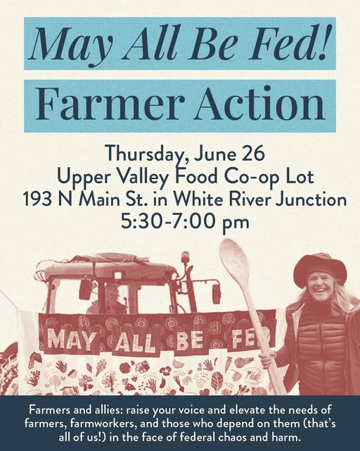 Everyone deserves access to nutritious, affordable food—and the people who grow and harvest it deserve safety and respect. Join NOFA-VT and Vital Communities at the Upper Valley Food Co-op parking lot for the “May All Be Fed” Farmer Day of Action at 193 North Main Street, White River Junction, VT. Farmers, farmworkers, and community members are coming together to call for a stronger, fairer food system—one where no one is left behind.